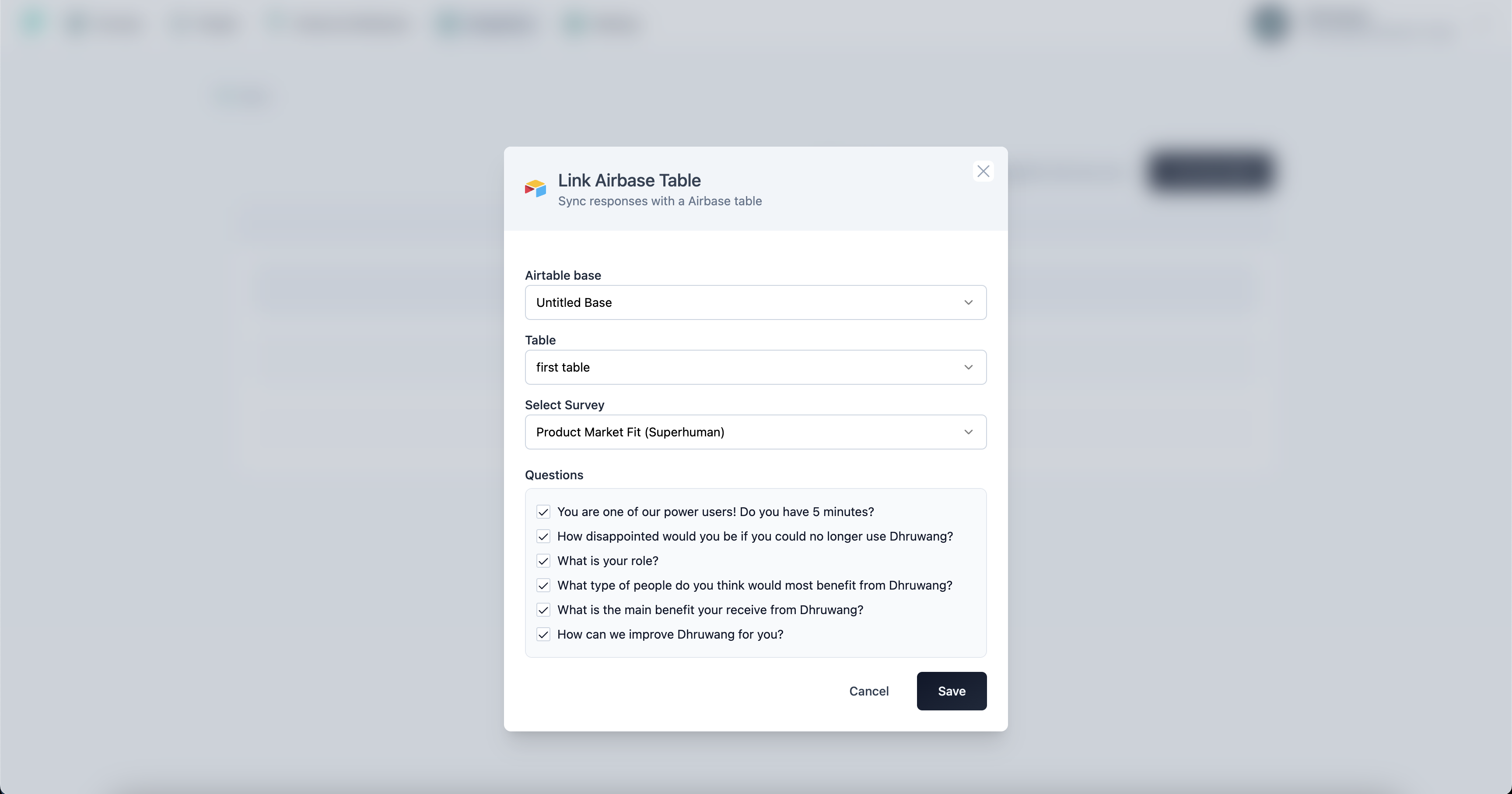 - Select the Base and table you want to link with Formbricks and the Survey. On doing so, you will be asked with what questions' responses you want to feed in Airtable. Select the questions and click on the "Save" button.